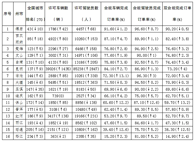 根据全国网络预约出租汽车监管信息交互平台统计,截至2025年9月29日,在内地31个省份网约车合规率排名中,云南排第21位,下降1位;双合规完成订单率为67.70%,环比上升3.8%,同比上升3.46%,低于各省平均值(69.38%)。全省网约车许可车辆78640辆,增加2179辆;许可驾驶员数234289人,增加4940人。