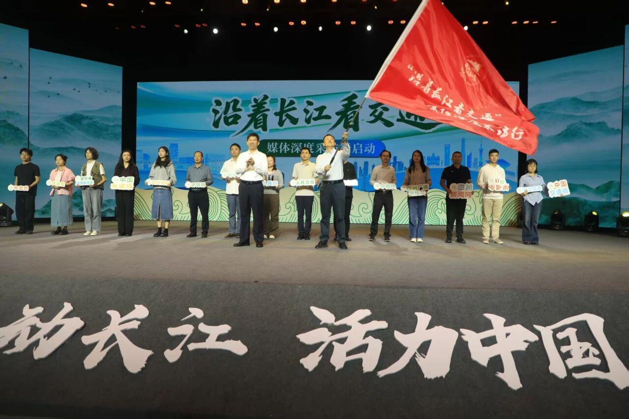 长航局纪委书记鲍郁峰为参与主题采访的媒体代表授旗。当天,来自中央、地方及行业的20多名记者走进长江航运,实地感受长江大保护、智慧长江建设成果和四川宜宾水运经济发展情况。