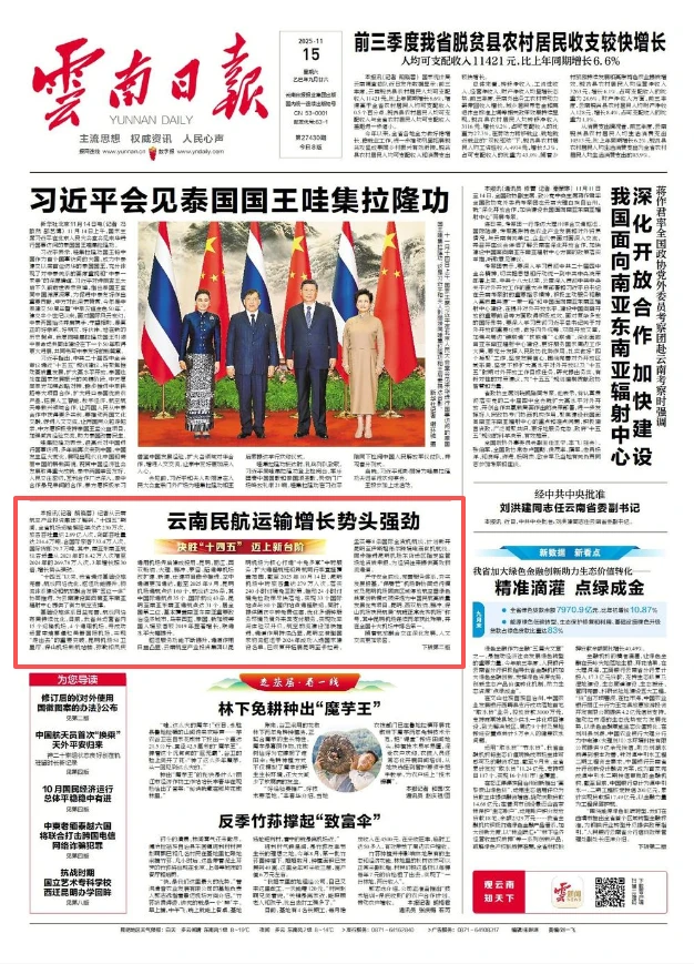 “十四五”以来,我省通过基础设施完善、航线网络优化、枢纽功能提升、物流体系建设和航旅融合发展“五位一体”协同推进,为云南建设面向南亚东南亚辐射中心提供了有力航空支撑。
