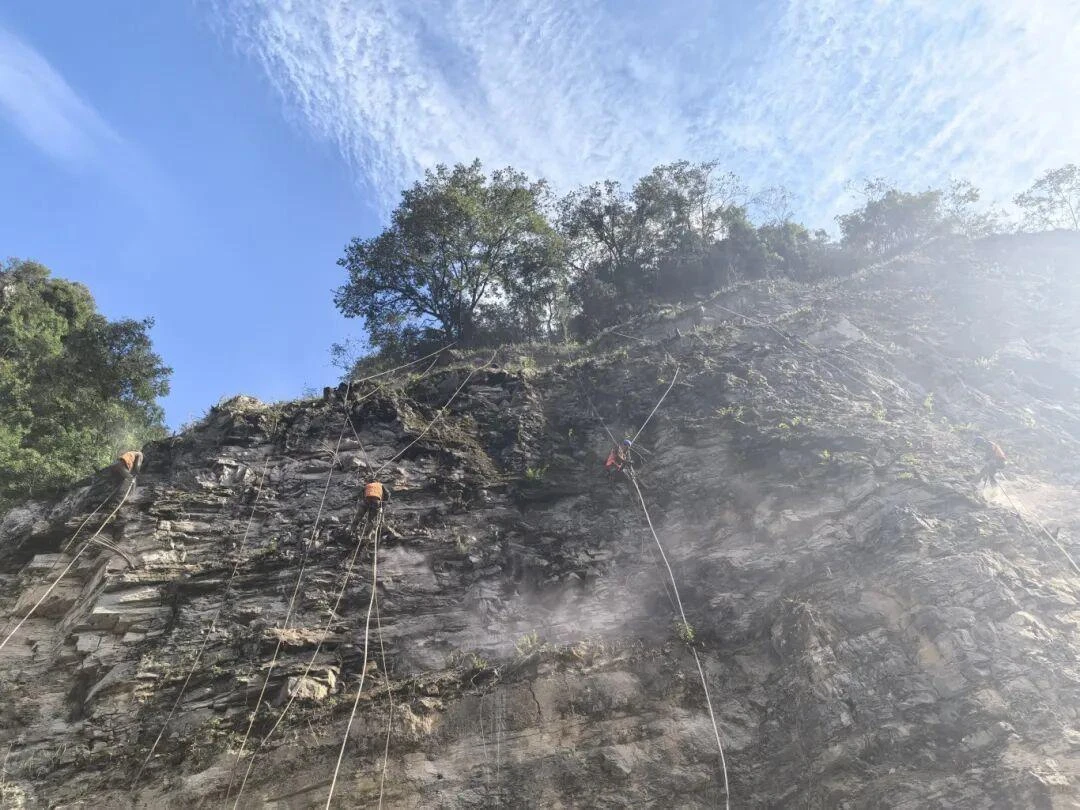 高边坡作业是本次施工的最大难点。工程在30米以下搭设脚手架,30米以上采用百吨级高臂吊车运送人员至作业面,最高施工高度达80余米。单次吊装升降耗时近2小时,单个钻孔深度约20米,技术复杂、安全风险高。