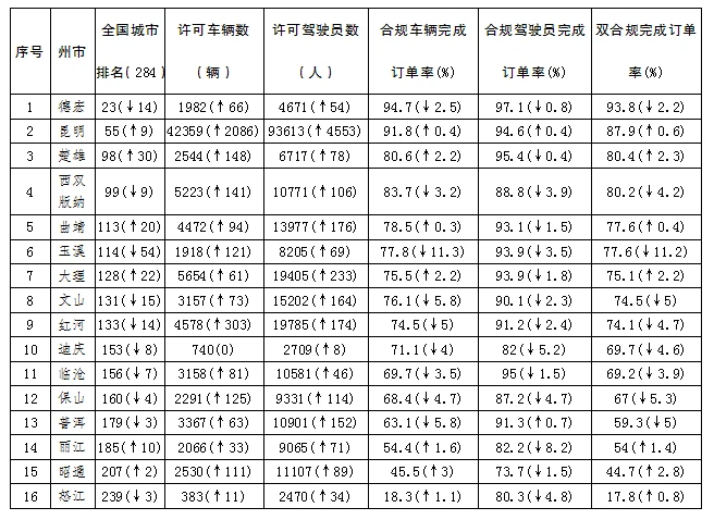 根据全国网络预约出租汽车监管信息交互平台统计,截至2026年1月3日,在内地31个省份网约车合规率排名中,云南排第15位,与上月排名一致;双合规完成订单率为77%,环比下降1.5%,同比上升16.03%,高于各省平均值(67.11%)。全省网约车许可车辆86422辆,增加3517辆;许可驾驶员数248510人,增加6121人。