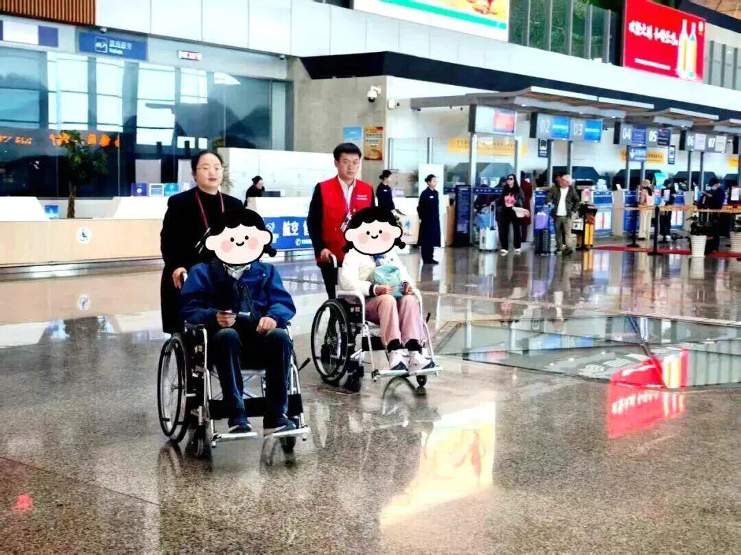 在腾冲机场,志愿者陪护两位行动不便的旅客出行。