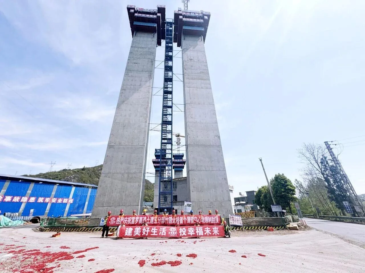 近日,富罗高速竹园大桥11#墩左幅及右幅空心薄壁墩顺利封顶。