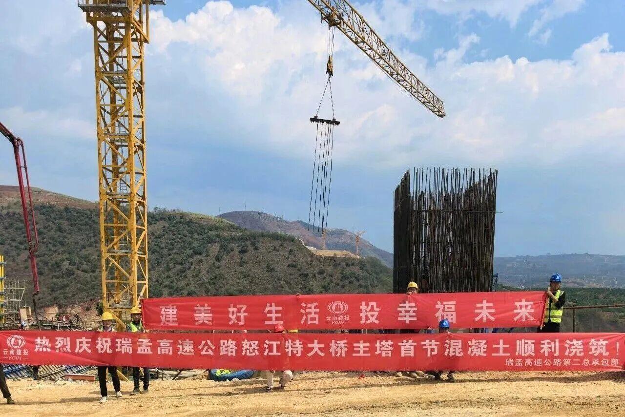 3月25日,瑞孟高速(保山段)勐糯怒江特大桥主塔首节混凝土顺利完成浇筑。