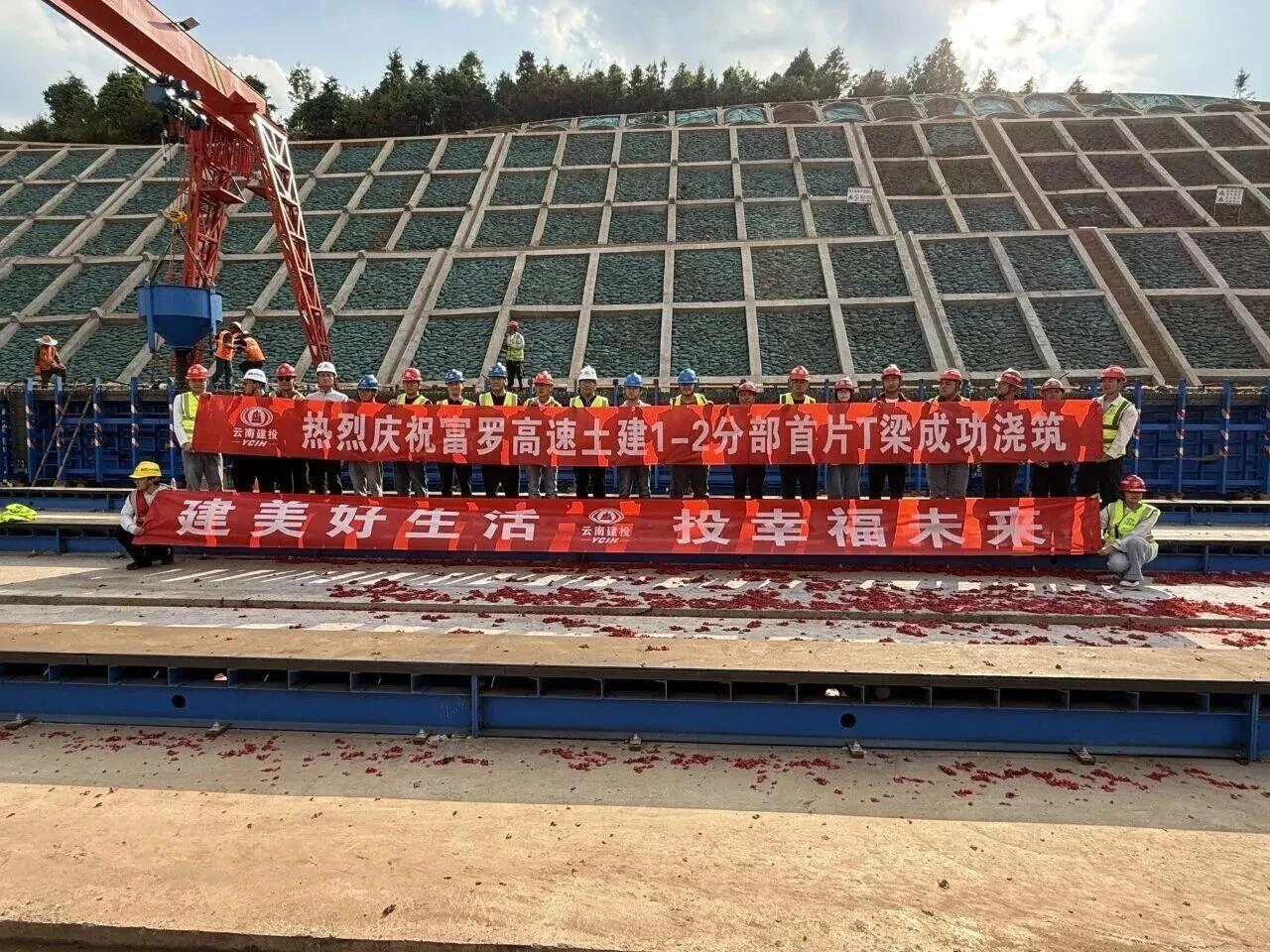 4月20日,富罗高速公路土建1-1.2分部首片T梁顺利浇筑完成,项目桥梁上部结构施工迈入关键阶段。